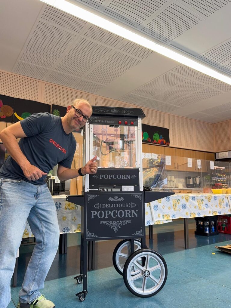 Der Förderverein bereitet sich auf den Tag der offenen Tür vor und freut sich über die neue Popcornmaschine, die am Tag der offenen Tür eingeweiht wird.